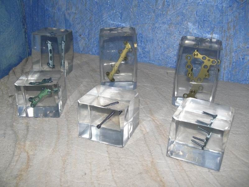 Der Kunde wollte seine OP-Teile in UV-Beständigem Gießharz eingegossen haben, damit man die Kleinteile besser von jeder Seite betrachten kann. Weitere Anschauungsobjekte im OP- Bereich.