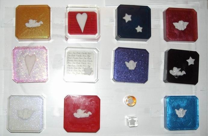 Für einen Schmuckhersteller, wurden hier verschiedene Objekte, in verschieden eingefärbten Hintergrund eingegossen.